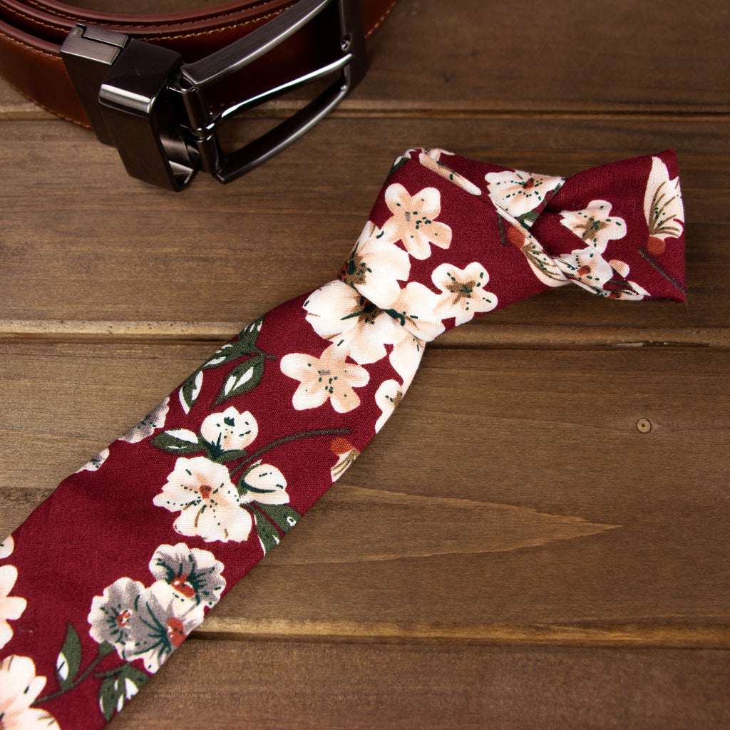 Men's Floral Necktie and Pocket Square Handkerchief Hanky Set, Burgundy (Color F37)