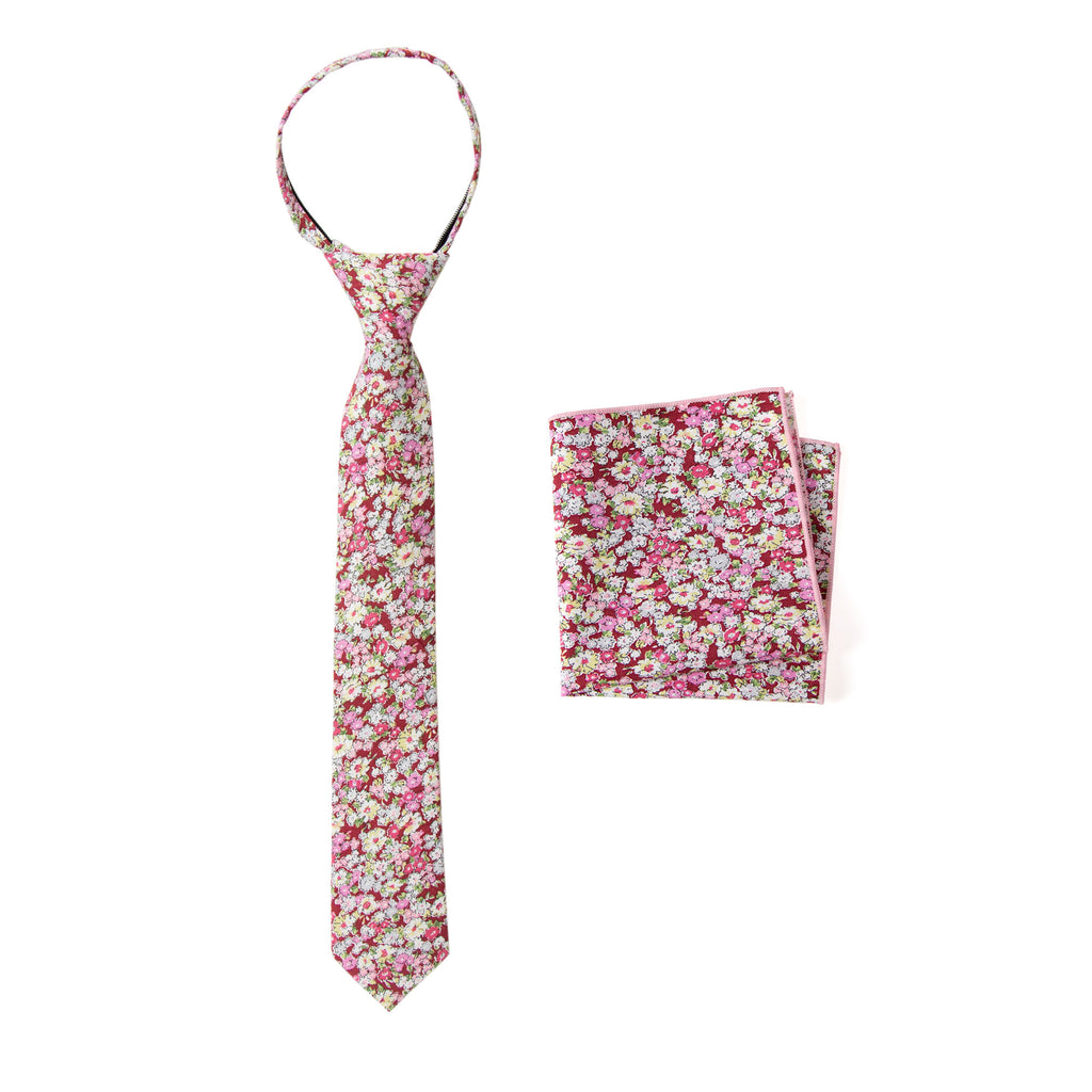 Boys' Cotton Floral Print Zipper Necktie and Pocket Square Set, Cinnamon (Color F46)