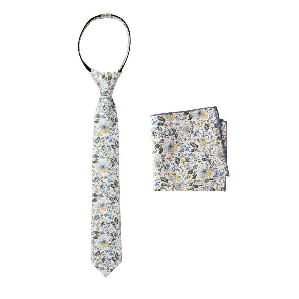 Boys' Cotton Floral Print Zipper Necktie and Pocket Square Set, Gold Metallic (Color F44)
